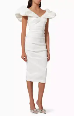Ruched Taffeta fitted dress with styled voluminous sleeves. Sleeves can be worn high on the shoulder or off the shoulder. Fully lined over the knee length dress with a back hem split and a back invisible zip