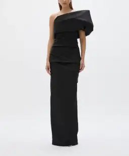 The Kat Gown is a form fitting column silhouette designed as a off the shoulder silhouette detailed with a hand draped one shoulder detail.