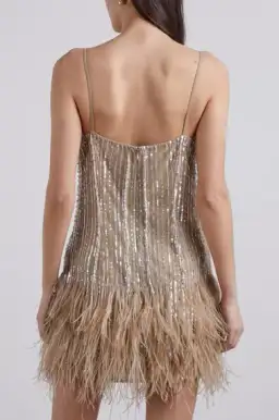 - Embellished outer; lined- Slim shoulder straps- Feathered hemline