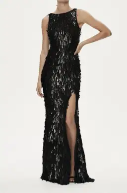The Opus Gown features a soft boat neck design and front left side split. With hanging sequin detailing, this gown can be worn to any black-tie event.