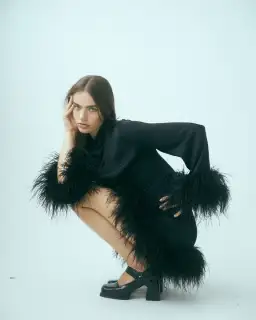 "A luxurious mini crafted from 100% viscose, offering a modern take on traditional event dressing. Complete with voluminous sleeves, feather trimmings and a high neck for a playful yet sophisticated look."