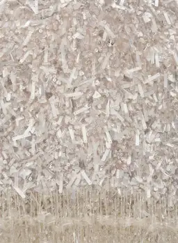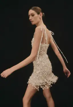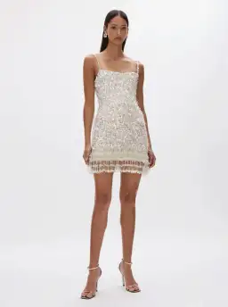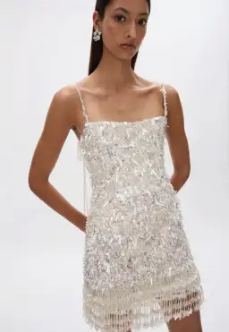 The Posie Mini is a form fitting mini silhouette. It is densely beaded with flat metallic sequins and detailed with a beaded fringed hemline.