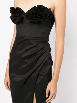 Black floral appliqué gathered detailing strapless sleeveless open back front slit rear zip fastening mid-calf length.