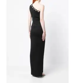 The Stella Gown is a black one shoulder Neoprene full-length silhouette with soft embellished crystal details surrounding a waist cut-out. Complete with a high thigh split.