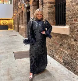 Dry clean only. Fully lined. Hidden back zipper closure. Dyed feather cuffs. Heavyweight sequin embellished fabric with side seam slit.