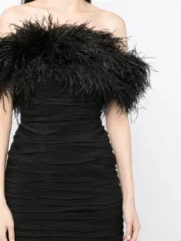 Zion feather-trim ruched gown. Zion feather-trim ruched gown from RACHEL GILBERT featuring black, feather-trim detailing, Bardot neckline, full-length, rear slit and ruched detailing.