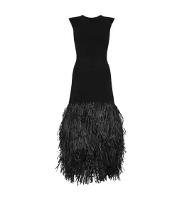 Knitted midi dress Encased shoulder padding Open back detail Bell-shaped skirt Invisible zipper at centre back Statement raffia detail at dress hem