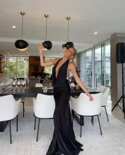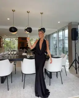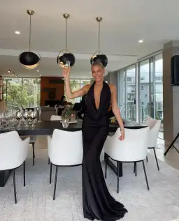 When the sun goes down, dial up the drama in the Donyale. In timeless black satin, this irresistibly captivating dress will make the impact you deserve. With a deep cowl, scoop back and tie halterneck straps, the sultry silhouette delivers hypnotic nighttime style.