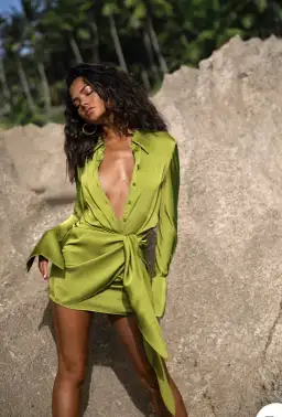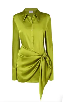 A forever wear button- down silhouette remixed with a wrap mini skirt and waist tie detail and beautiful oversized cuffs. Beautiful, elegant with a pop of emerald green satin finish, this dress will definitely turn heads! Wear unbuttoned as low as you dare and style with gold accessories with slick back hair or if you feel like letting your hair down. Pair with knee high leather heel boots to complete the look.