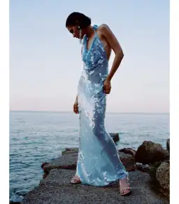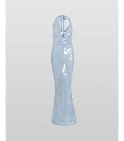Drenched in cornflower blue paillettes from neckline to hem, Anais shimmers and glistens like the sun on water. An adjustable cowl neckline and waist tie makes it easy to find your perfect fit.