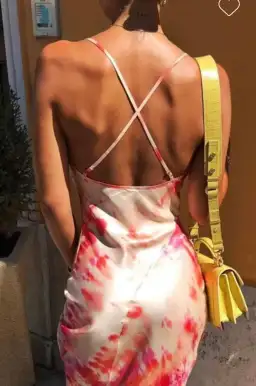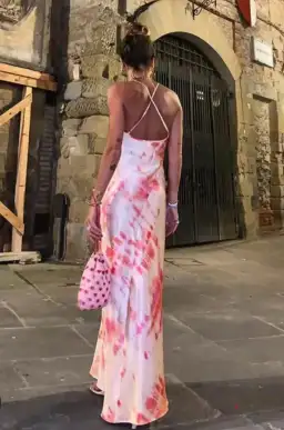With a subtle and modern revamp on tie-dye, this floor-length gown is cute, playful and bright. It features a silk blend material with adjustable straps, a cowl neckline and cross-back detailing.