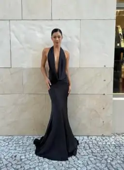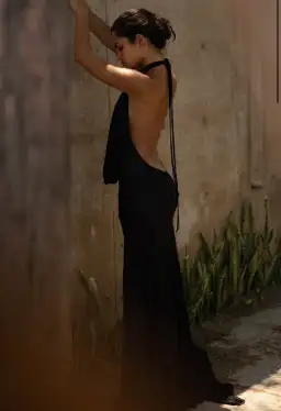 - This full length gown features a deep cowl neckline with neck tie which allows you to adjust the top for the perfect fit. Complemented by an low cut, open back for the ultimate feminine look