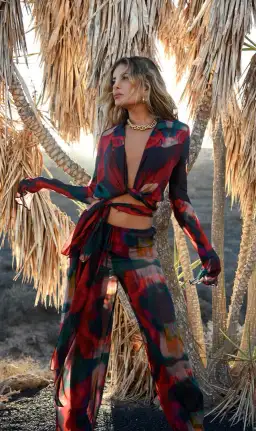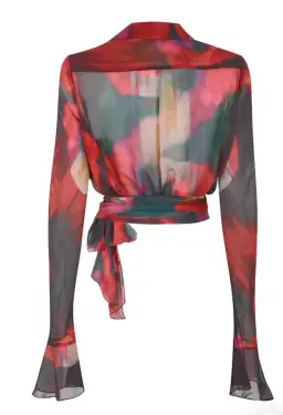 Semi-sheer and sultry style is cut to a wraparound silhouette with detailing of long ties to style numerous ways. The iconic flared Rat & Boa sleeve cuffs, with the abstract poppy print gives feminine notes to this absolutely power piece.