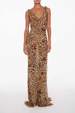 Taking our enduring love of animal print and elevating it with luxury details, the Laviza dress is an ultra-flattering, cheetah print maxi crafted from semi-sheer viscose, with a timeless, sophisticated silhouette that offsets its wild side. A perfectly flawless occasion dress, it blends a floor-skimming shape with a slit skirt, cowl neckline and a low back framed with twist detailing and delicately criss-crossing straps