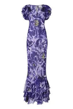 A more-is-more maxi that's made for drama. Conjured in a bold, blue iris orchid print with ruffled shoulders and floor-weeping hem that move as you move, Lucille is made for dancing all night.