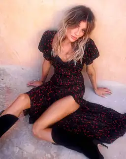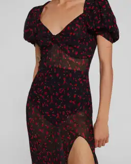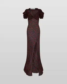 Cut to a slim fitting shape with exaggerated sleeves and a sweetheart neckline that is knotted across the front; the 'Magnolia' is feminine and floral with an edge of fierce.Pair the thigh slit with an over the knee boot to bring to life the everlasting power pairing of ditsy floral and leather - achieving that ever-cool 90s sexy grunge girl look.