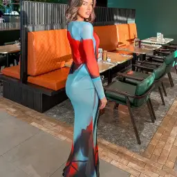 Crafted from a sheer mesh fabric, with its long sleeves and flattering silhouette, the bold blue colour acts as a canvas for the vibrant red tulip print, creating a captivating contrast that demands attention.