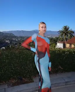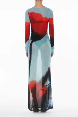 Crafted from a sheer mesh fabric, with its long sleeves and flattering silhouette, the bold blue colour acts as a canvas for the vibrant red tulip print, creating a captivating contrast that demands attention.