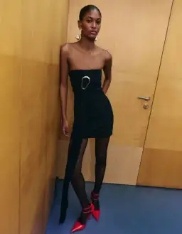 Selma is a rework of the classic little black dress, unapologetically bold and effortlessly undone. Cut to contour with a fluid, flattering drape detail, this piece is defined by a bold silver buckle detail that does the accessorising for you