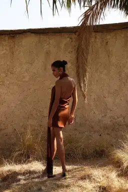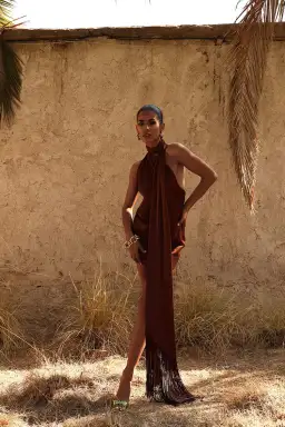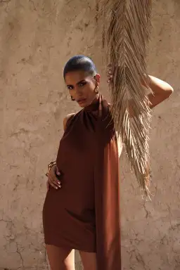 A slinky one-shouldered mini dress with our signature cowl back, the Serafia in cocoa has an elegantly-tasselled scarf that you can wrap around you in ways that are only limited by your imagination.