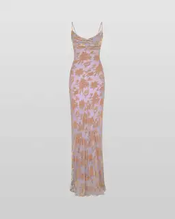 All eyes on you in Athena. Cut with precision to skim your silhouette, and with a keyhole back and dropped cowl neckline from semi-sheer devoré, she flatters and flirts wherever she goes.