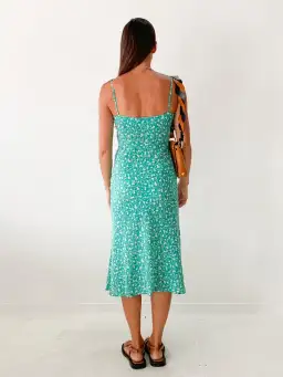 3/4 length midi dress Fitted corset style top (same shape as the 'Emilie') Slight curve at centre of bust line Adjustable spaghetti straps Bias cut silk skirt Slim fit Invisible zipper at the side