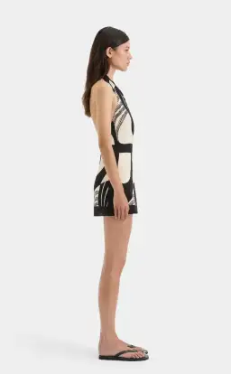 The Realisme Wrap Halter Mini is a modern shape, crafted from a naturally sourced silk crepe in the Papier print, an abstract monochrome print exclusive to SIR. Featuring a draped silhouette with a wrapped waist and an open back detail. Designed to be worn as both a mini dress or over a pant.