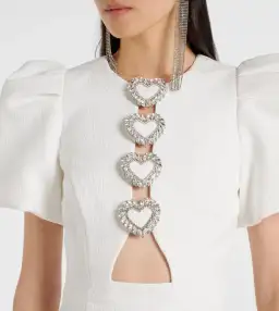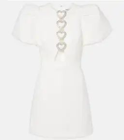 The Alicia Puff Sleeve Mini Dress in ivory is a chic and glamorous dress, embellished with diamante heart details. Crafted from textured bonded crepe, it features voluminous short puff sleeves and a rounded neckline, beautifully complemented by a fitted bodice with front cut outs. The A-line mini skirt shapes a graceful silhouette, enhanced by a cinched waist to flatter the figure. Secured with a zip fastening at the back and lined for comfort, the mini dress radiates bridal elegance, making it an ideal choice for brides-to-be at wedding celebration events.