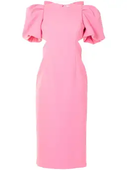 Candy pink Ally cut-out midi dress from REBECCA VALLANCE featuring bow detailing, cut-out detailing, short puff sleeves, rear zip fastening and rear slit.