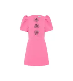 The Aubree Flower Mini Dress is a stunning rosey pink addition to your wardrobe. Featuring hand embellished diamante floral details adorned on the fitted bodice with front cut outs, the rounded neckline and cinched waist add a touch of elegance to the A-line silhouette. Voluminous short puff sleeves elevate the playful and chic design. At the back of the dress, a zip fastening ensures a secure fit with the addition of comfort from the dress being fully lined.