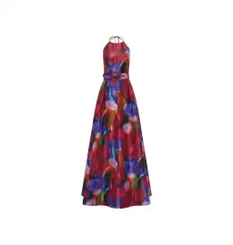 The Cabaret Roses Gown is a captivating blend of timeless elegance and modern design, tailored from taffeta in a playful floral print. The halter neckline and fitted bodice create a flattering figure, complemented by an open back and neck tie for a touch of allure. Cinched at the waist with a self-belt, the circular skirt forms a graceful silhouette, complete with lining for utmost comfort. Secured with an invisible zip fastening at the back, this gown is the perfect choice for your next special occasion.