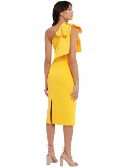 Stand out at your next event with Rebecca Vallance's Calla One Shoulder Midi dress. This stylish yellow number features a chic one-shoulder neckline with a statement bow detail and a fitted waistline. With a flattering midi length, it's the perfect choice to rent for your upcoming formal or cocktail event.