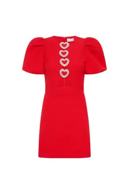 The Chiara Puff Sleeve Mini Dress effortlessly balances elegance and playfulness. Crafted from textured crepe, this mini dress features charming diamante hearts. The rounded neckline complements the fitted bodice, which boasts front cutouts for a hint of allure. Voluminous puff sleeves add a touch of drama, while a cinched waist leads to an A-line mini skirt for a flattering silhouette. A zip fastening at the back ensures a secure fit, and the dress is fully lined for comfort, making it a perfect choice for various occasions.