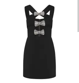 The Eliana Bow Mini Dress is embellished with diamante bow details, the fitted bodice features front cut outs and a halter neckline, a low back supported by thick straps. cinched waist and an A-line mini skirt, invisible zip and fully lined.
