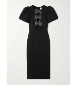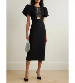 The Eliana Puff Sleeve Midi Dress epitomises timeless elegance infused with modern design. Adorned with beaded bow embellishments, the fitted bodice with front cut outs and rounded neckline beautifully complements the voluminous short puff sleeves, offering a sophisticated silhouette.