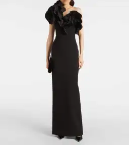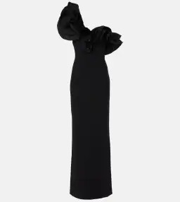 The Ella Gown in black is a captivating statement dress, perfect for your next special event. Tailored from bonded crepe, the gown showcases an elegant modern design featuring a one shoulder applique taffeta neckline.