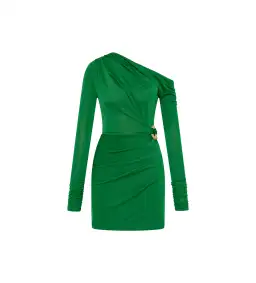 The Erin Long Sleeve Mini Dress captivates in emerald, infusing modern style with playful elegance. Tailored from premium jersey, the asymmetrical silhouette is effortlessly elevated by the off the shoulder neckline and body-skimming fit with tuck detailing. Gathered long sleeves and the fitted mini skirt offer both comfort and chic style, while the gold ring embellishment adds a touch of opulence to the design. Whether for day or night, this dress is a perfect choice for your next event.
