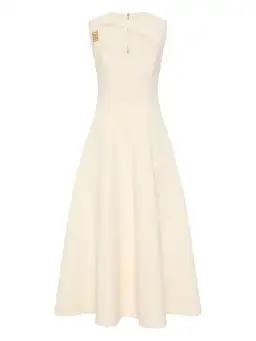 The Freyja Midi Dress radiates modern elegance in cream. Tailored from bonded crepe, its fit-and-flare silhouette is accentuated by an asymmetrical bodice and open neckline, adorned with gold art deco trim. Polished and refined, this lined dress is finished with an exposed zip fastening at the back, making it an ideal choice for your next special event.