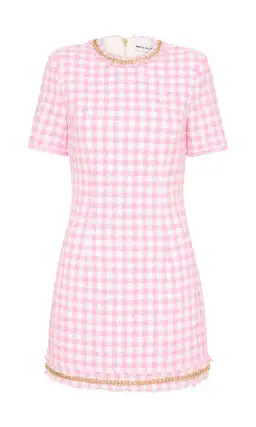 The Gabrielle Short Sleeve Mini Dress is a preppy silhouette that effortlessly combines style and flair. Made from boucle fabric, it features a chic short sleeve design with a rounded neckline, creating a feminine and elegant look. Its fitted silhouette accentuates the wearer's curves, while the gold chain and fringing detail add a touch of sophistication. The dress is conveniently fastened with a zip at the back and is lined for added comfort.