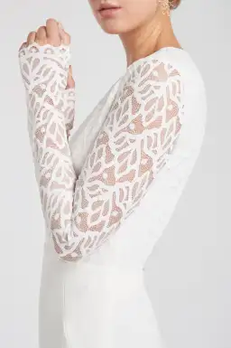 - Lace overlay on bodice with sheer contrasting lace sleeves