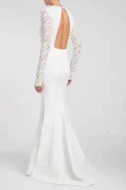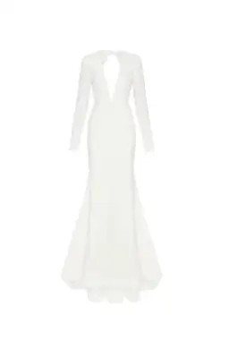 The romantic Harper Gown is designed from a thick structured crepe for a close, slim fit to the body and elegantly flare out to a mermaid hem with dramatic train. The lace overlay on bodice and sheer contrasting lace sleeves add a touch of romantic glamour and the plunging neckline and back cut out create drama and the front mesh insert provides support. Style with drop earrings and stiletto sandals for a modern wedding look.