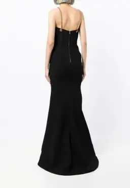 Textured bonded fabrication, lined, Fitted bodice, Gold-toned chain straps- V-wire neck line, floor length.