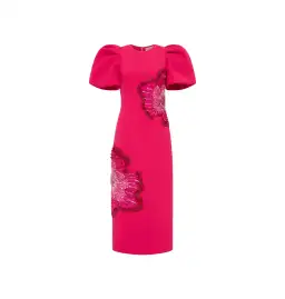 The Layana Midi Dress in raspberry is an eye catching dress that combines a unique hand embellished floral sequin applique design with timeless elegance. Voluminous short puff sleeves and a rounded neckline effortlessly complement the fitted bodice, enhanced by princess seams that accentuate the feminine pencil skirt silhouette. A back split and exposed silver zip fastening at the back add both allure and functionality to the design.