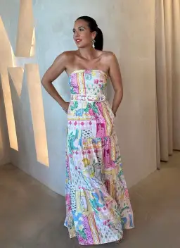 Beautifully crafted from an exclusive border placement print, the Le Mur Rose Maxi Dress is cut in a medium-weight linen blend, designed with a fitted bodice with a shirred bust, side pockets and both removable and adjustable straps for versatility. Style yours with nude strappy heels and your most cherished gold hues. Item fits true to size.