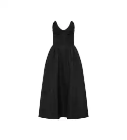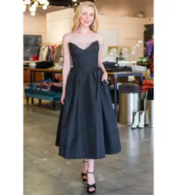 The Luiza Strapless Midi Dress in black radiates timeless elegance and modern style. Tailored from watermark taffeta, the strapless neckline and fitted bodice are supported by boning, ensuring both comfort and a flattering fit. The circular midi skirt, cinched at the waist, enhances the feminine silhouette, exuding sophistication. Complete with a zip fastening at the back, this dress is fully lined, perfectly blending practicality with style.
