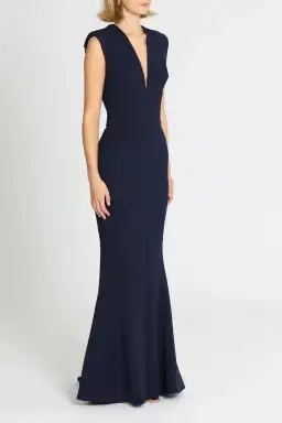 Elevate your formal season wardrobe with the timeless yet refreshed Mimosa Gown, a piece that will see frequent wear. In a versatile navy blue, this gown boasts a perfectly sculpted fit-and-flare silhouette, making it a minimalist's dream. The design features wide shoulder straps, a high waist, a plunge v-neckline, and a twisted back strap detail. This gown is an excellent choice to rent for red carpet events or ball occasions, complete with an open back and an exposed gold zip for added flair.