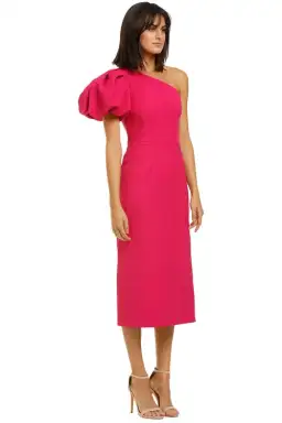 Elevate your style with this stunning hot pink midi dress by Rebecca Vallance. Crafted from textured fabric, it beautifully accentuates your curves with its bodycon fit. The dress showcases a chic one-shoulder neckline with a short puffed sleeve, and the straight fit skirt adds to its allure. Perfect for a fancy cocktail party or a wedding celebration, it's equipped with a concealed side zip for a seamless look.