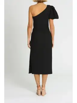 For the ultimate elegant formal look, consider the Natalia OS in Black by Rebecca Vallance. This dress, available for hire, is perfect for any occasion, be it a formal event or a party. It features an asymmetric neckline, short puff sleeves, and a side leg split for added style.