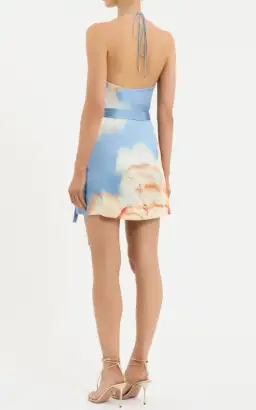 The Perez Mini Dress radiates playful elegance in an enchanting floral print, tailored from luxurious silk. Featuring a halter neckline adorned with a gold U-wire with beaded details, its low open back exudes feminine allure. The wrap mini skirt shapes a chic silhouette, cinched with a waist tie belt for added style. Finished with lining and a side zip fastening, this dress is perfectly polished and refined.