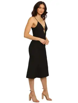 Experience the feeling of being a work of art in the beautiful Romy Midi in Black by Rebecca Vallance. This dress, available for rent, features a cut-out V neckline, flared skirt, midi length, spaghetti straps, and a deep V neckline connected by a ring accessory. Ideal for a cocktail party.